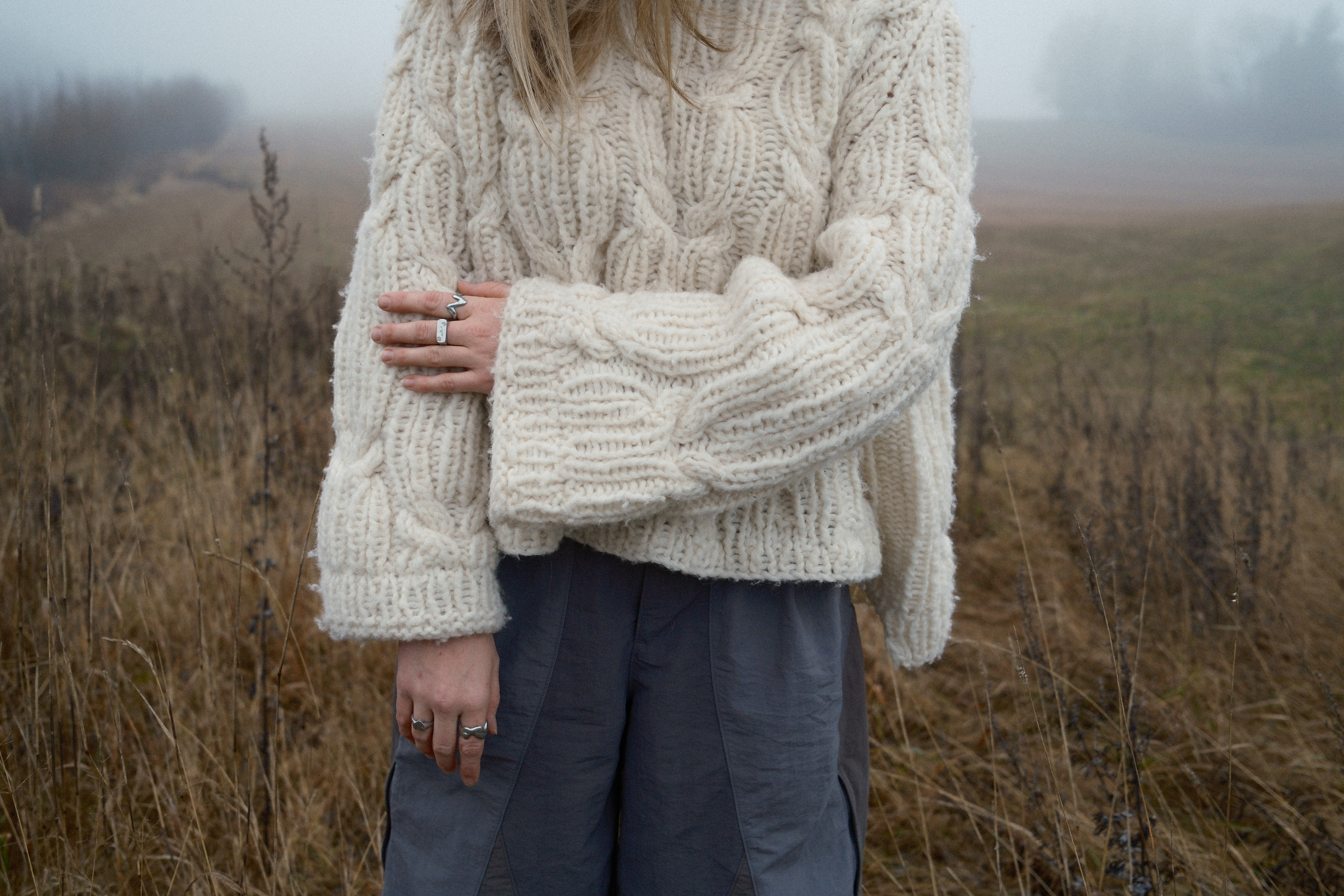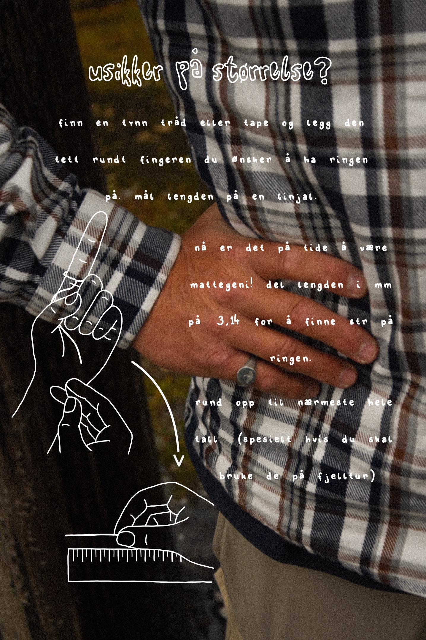 Alle ringene i kolleksjonen er av eget design og støpt i sand. Etter støping blir de nøye filet, pusset og polert for hånd. Ringene er laget i en blanding av tinn og sølv, en kombinasjon som gir både karakter og holdbarhet. På grunn av sanden de støpes i vil hver ring også få små unike merker. Vi velger å ikke file bort alle merkene, da vi mener disse gjør hver ring unik og personlig. Tinn er et relativt mykt materiale, så med tiden kan ringene få små riper. Vi ser på dette som noe positivt, et tegn på at ringen din er med på livet.